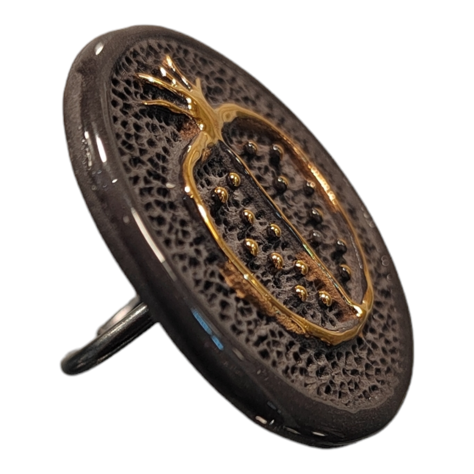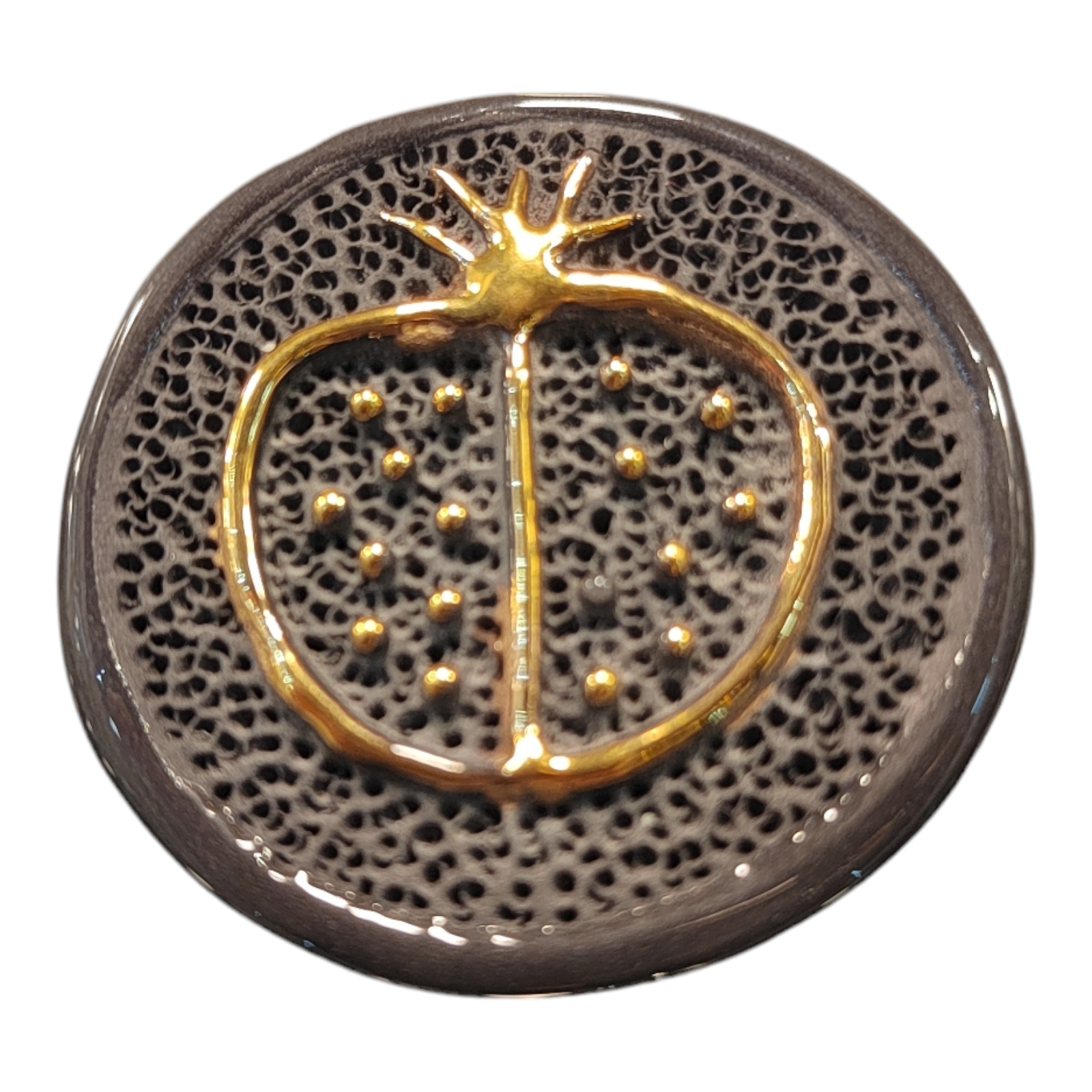 Cargada de simbolismo, la granada que decora su superficie representa la fertilidad, la prosperidad y la buena fortuna. Cada semilla es un recordatorio de la abundancia que la vida puede ofrecer.